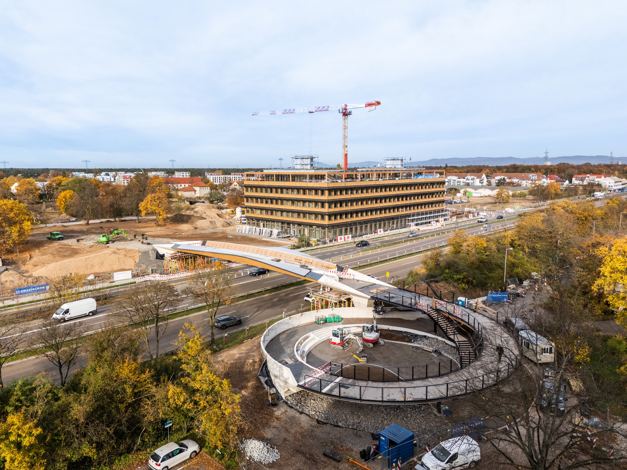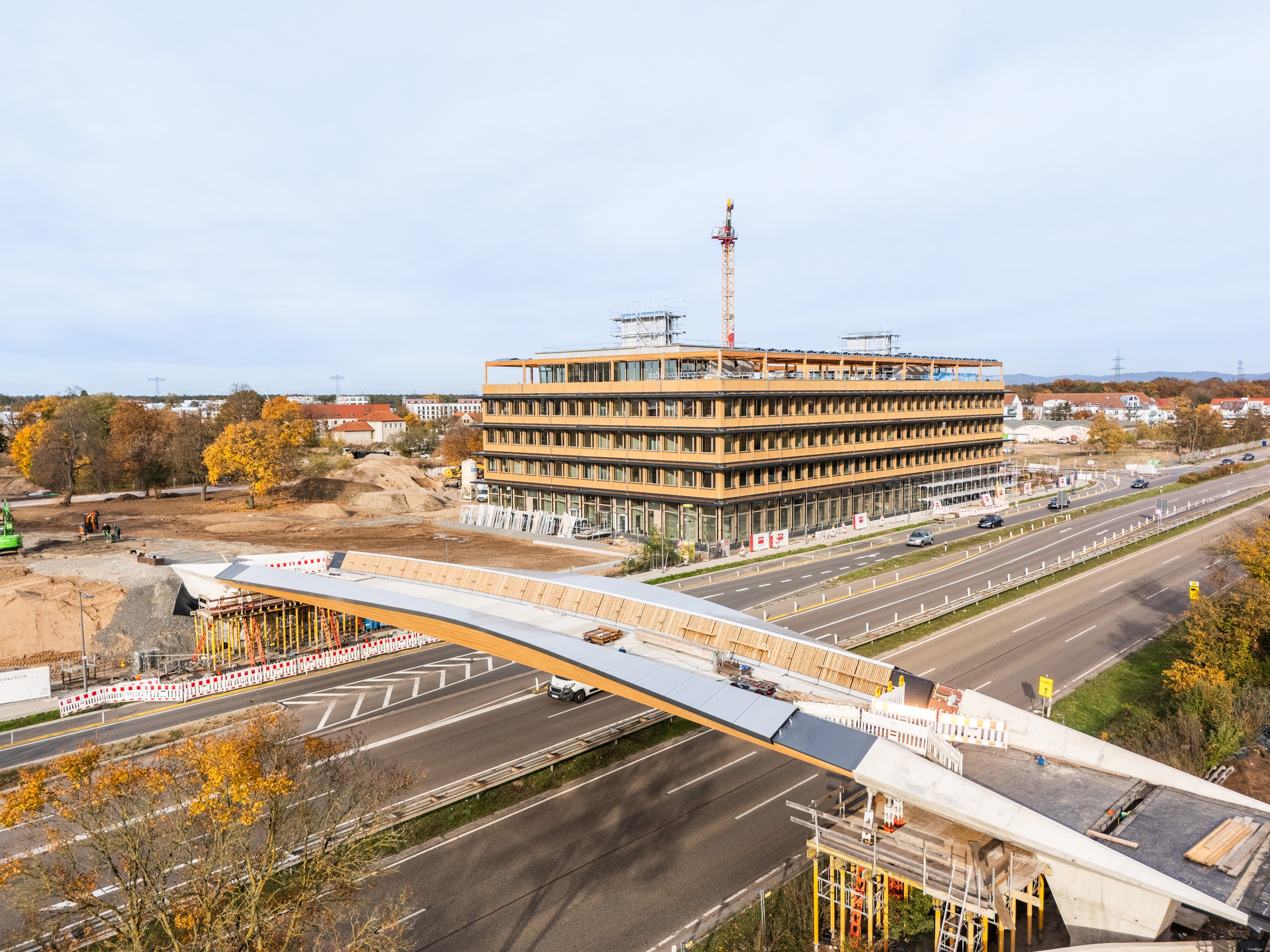 Der Franklin‑Steg in Mannheim ist ein innovatives städtisches Infrastrukturprojekt, das eine direkte, barrierefreie Querung über die stark befahrene Bundesstraße B38 für Fußgänger und Radfahrende ermöglicht. Für den Gehbelag und das Sekundärtragwerk wurden Carbonbeton-Fertigteile eingesetzt, die sowohl den Überbau als auch den gesamten Belagsbereich bilden. Die Platten variieren in der Dicke zwischen 80 und 119 mm, wodurch ein geringes Eigengewicht bei gleichzeitig hoher Tragfähigkeit erreicht wird.