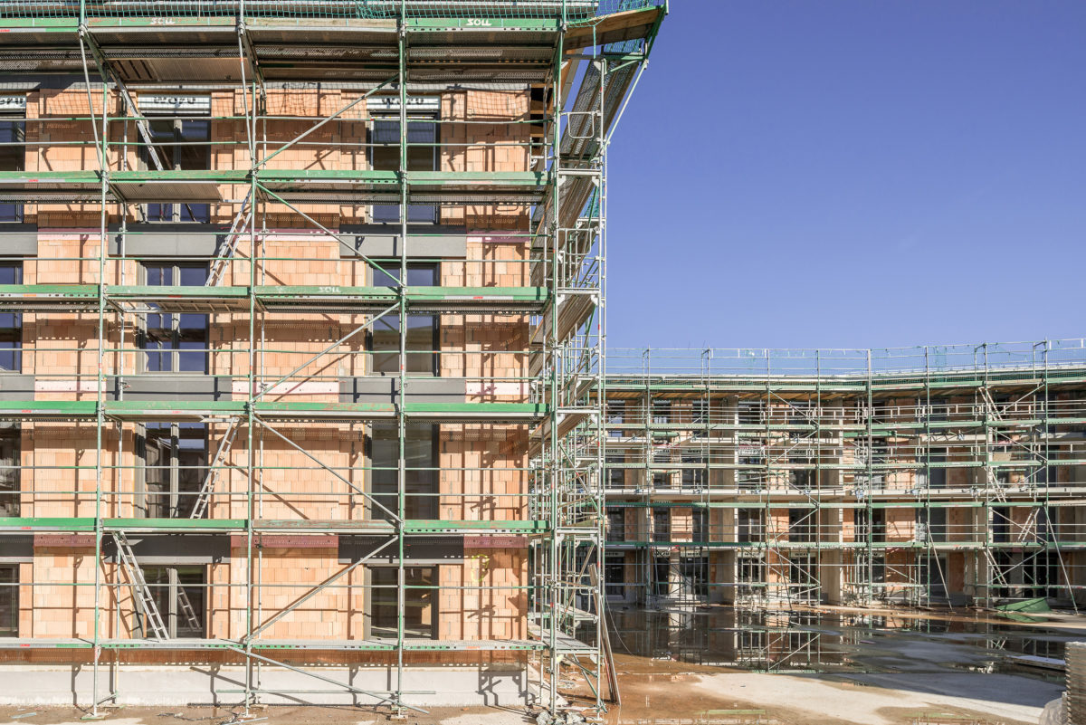 Neben Ästhetik und Komfort standen auch Materialität und Wertigkeit im Fokus der Planer. Aufgrund seiner bauphysikalischen Eigenschaften fiel die Entscheidung auf den Baustoff Ziegel. Für die Außenwände kam ein speziell für den Geschosswohnungsbau entwickelter Ziegel zum Einsatz. Dank im Ziegel integrierter mineralischer Dämmstoffpads erzielt er außergewöhnlich gute Wärmedämmwerte bei gleichzeitig hoher Tragfähigkeit sowie gutem Schall- und Brandschutz. Zusammen mit dreifachverglasten Kunststofffenstern, einer Fernwärmeversorgung mit temperaturgesteuerter Heizung sowie einer Kraftwärmekopplung mit regenerativem Energieanteil konnte der KfW-55-Standard realisiert werden. Die nichttragenden Innenwände bestehen ebenfalls aus verputztem, aber ungefülltem Ziegelmauerwerk.