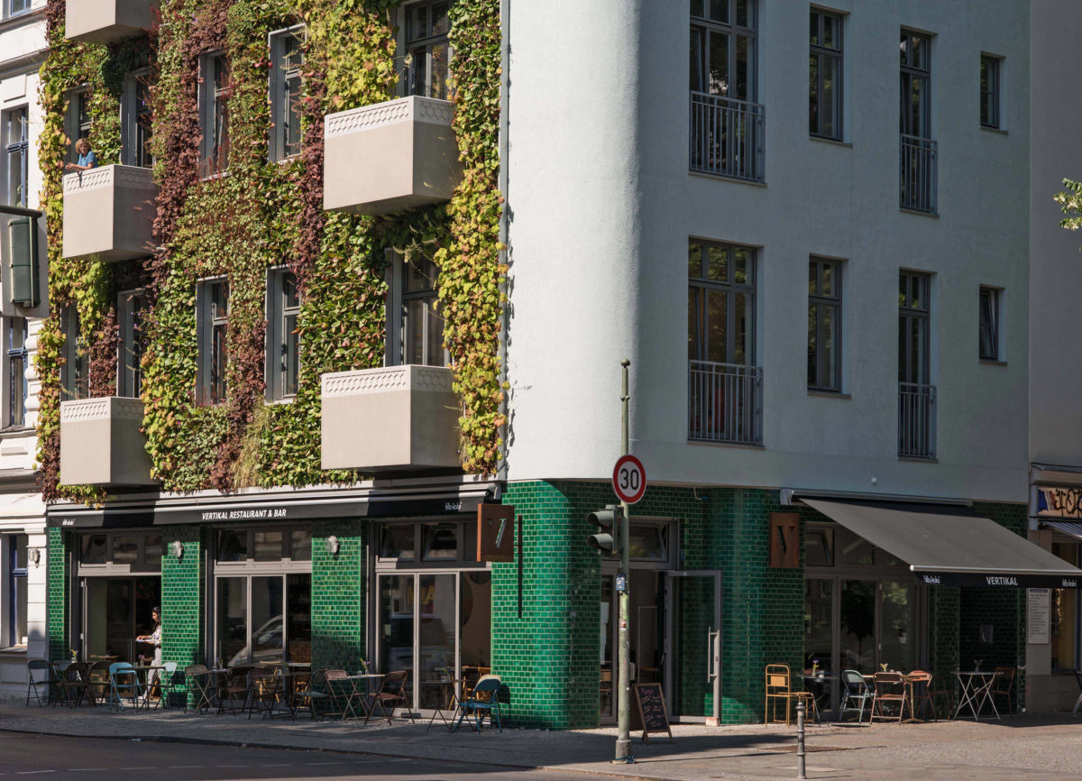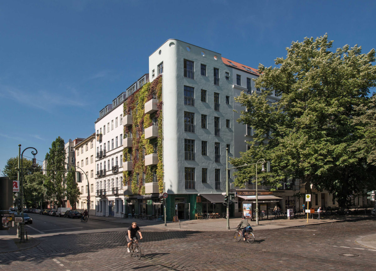 Sichtbarer Ausdruck des nachhaltigen Standpunkts ist die Gartenfassade zur Glogauer Straße. Die sogenannte „Living Wall“ führt durch die Absorption von Stickstoffoxiden und die Reduktion von Feinstaub zu einer wesentlichen Verbesserung des Mikroklimas der Straße. Verkehrslärm wird gedämmt und eine Aufwertung der städtischen Biodiversität angestrebt. Die Pflanzen wachsen auf einer im Ziegelmauerwerk verankerten Trägerkonstruktion und werden durch ein integriertes Bewässerungssystem versorgt. Die Bepflanzung ist winterhart, so dass die Fassade ganzjährig begrünt ist.