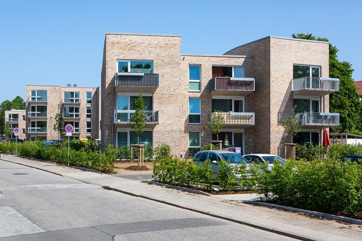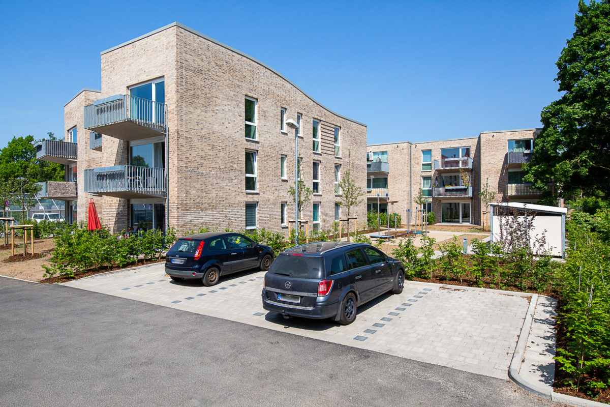 Die sieben neuen Gebäude reihen sich locker entlang einer Achse in Nord-Süd-Richtung. Optisch stechen die wellenförmig angelegten Flachdächer sowie die beige-braune Ziegelverblendschale hervor. Drei viergeschossige Häuser innerhalb der ansonsten dreigeschossigen Gebäudereihe setzen am Anfang, in der Mitte und am Ende einen städtebaulichen Akzent.