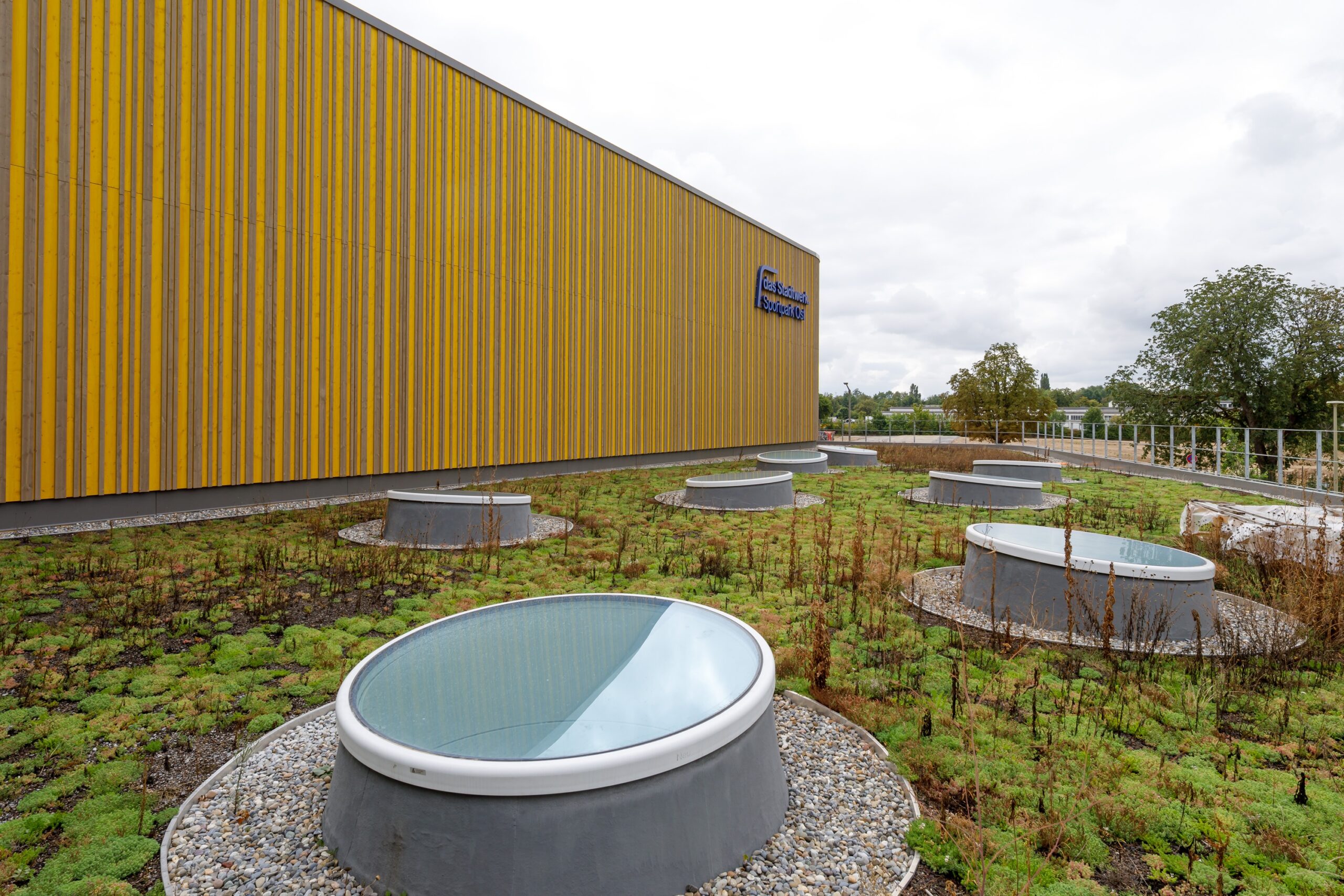 Die Energie für die Wärmeversorgung wird zu 100 Prozent CO2-neutral über Kollektorfelder über den Parkplatzflächen erzeugt werden und in einem 500 Kubikmeter Pufferspeicher zwischengespeichert. Saisonale Verbrauchsspitzen können über eine Hackschnitzelheizung abgedeckt werden. Strom wird direkt auf den Hallendächern erzeugt. Eine 20 Kubikmeter fassende Regenwasserzisterne wird über die Dachfläche den Niederschlag auffangen und darüber die Fassadenbegrünung und die Sportrasenflächen bewässern. Intelligente Lichtplanung bringt künftig zudem möglichst viel Tageslicht in die Innenräume und sorgt somit für direkte Stromeinsparung.