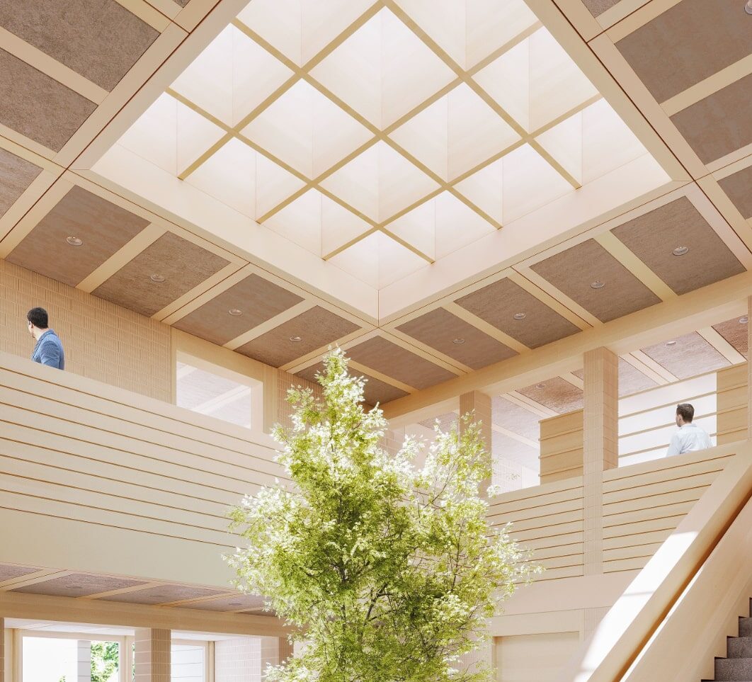 Die in dem Projekt verbauten Holz-Lehm Massivdecken von Leipfinger-Bader sind angelehnt an die historische Stakendecke. Die feingliedrige Tragstruktur besteht aus Holz. In diese wird ein speziell entwickeltes Massivlehmgemisch mit einer Rohdichte von 2.200 Kilogramm pro Kubikmeter gegossen. Es erzeugt Raumabschluss, Brandschutz, Schallschutz und thermische Masse. Zeit- und kostenintensives Stampfen entfällt. Die bis zu 7,5 Meter langen Holzelemente werden manuell zusammengefügt, bei Leipfinger-Bader mit Lehm vergossen und als Fertigteile auf die Baustelle geliefert. Diese Decken bieten hervorragende Schall- und Brandschutzeigenschaften und sind vollständig recycelbar.